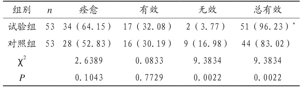 试验组治疗效果显著优于对照组(P<0.05),见表1。