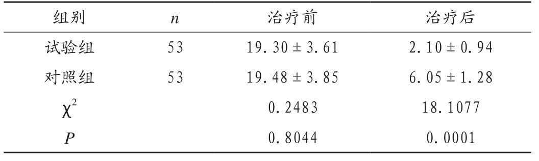 治疗后,试验组的症状积分显著少于对照组(P < 0.05),见表 2。