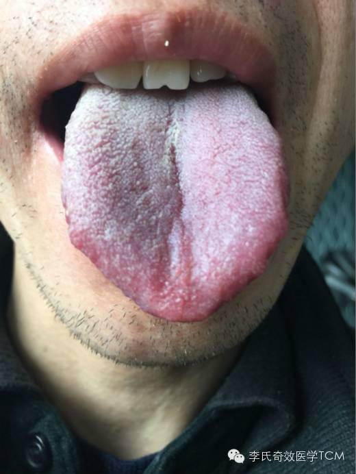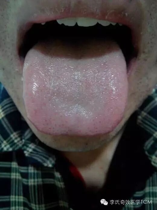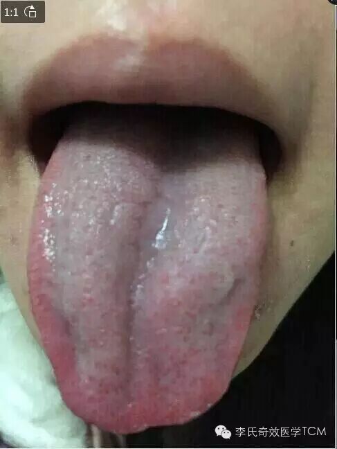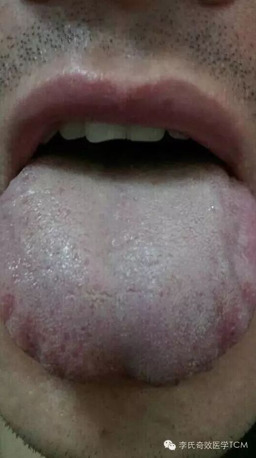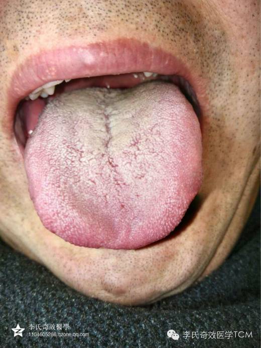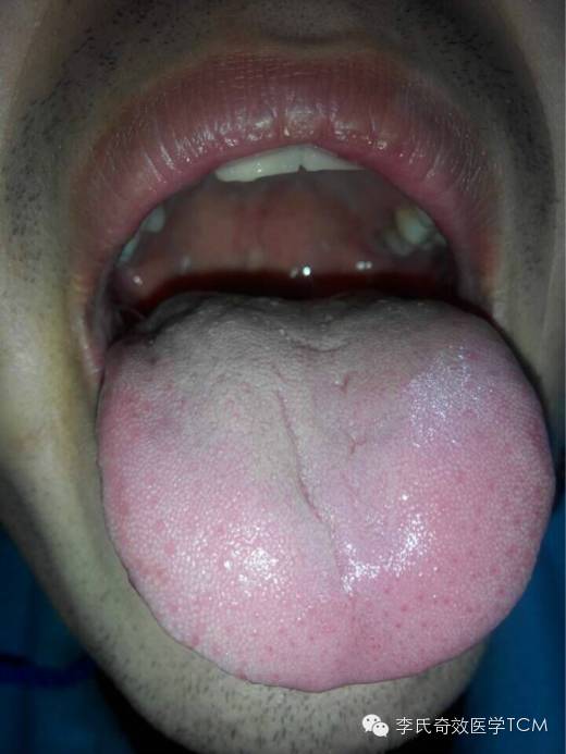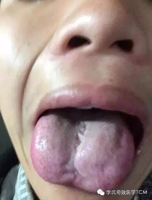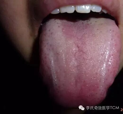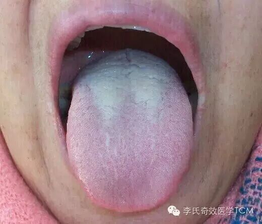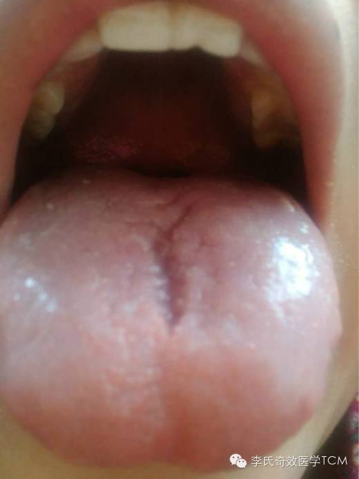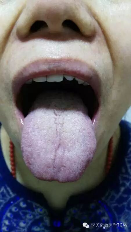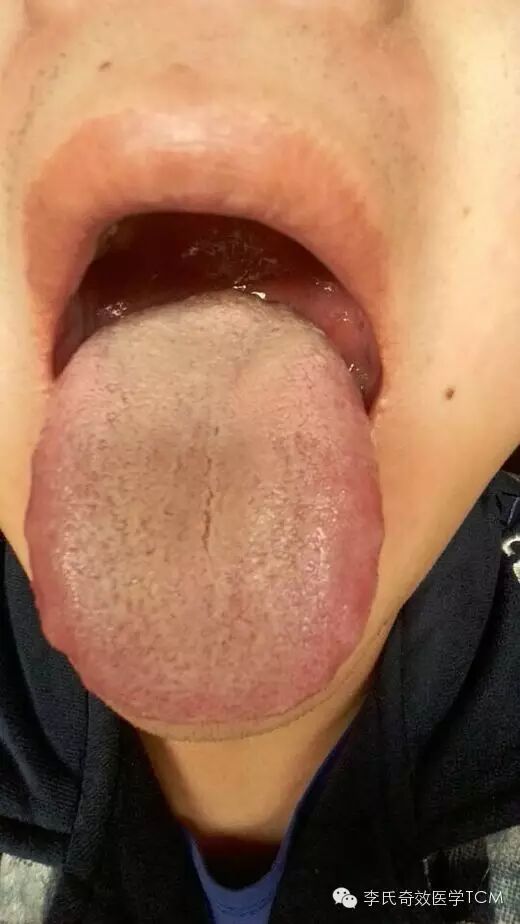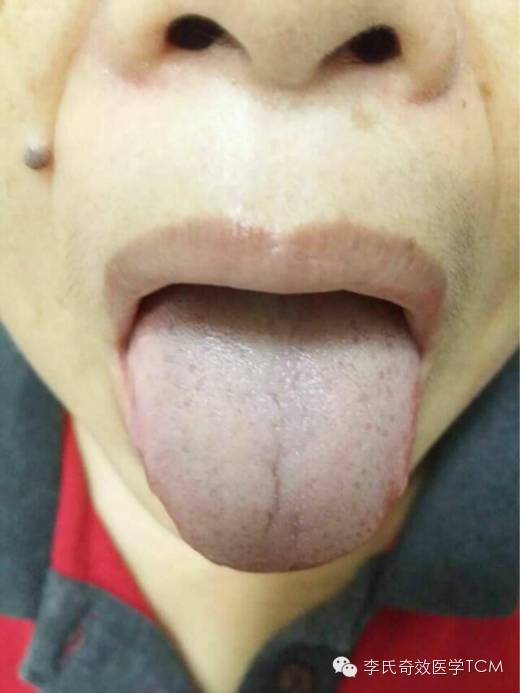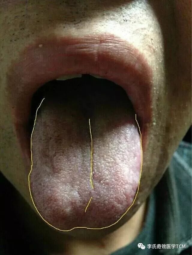 这个舌象舌根苔厚腻,前面也是有不太明显的两条对称的肝郁线。