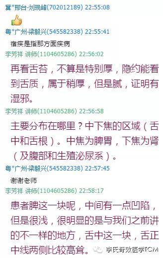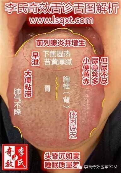 另外舌根苔厚腻,下焦痰湿,痰湿易遏气机,容易阳郁化热,产生“湿热”,下焦湿热更多的见于西医所说的炎性疾病,比如男性可见于前列腺炎啊,女性妇科炎症啊,盆腔炎,盆腔积液,阴道炎啊,白带多或如豆腐渣状,特别是舌根腐腻苔的时候,那就是一种豆腐渣白带一样的“象”嘛,男性还可见到早泄或阳痿的表现,如果伴有齿痕还会出现小便尿不尽,尿有余沥的表现,就是小便完,一用力还会有尿排出,这是前列腺炎的表现。