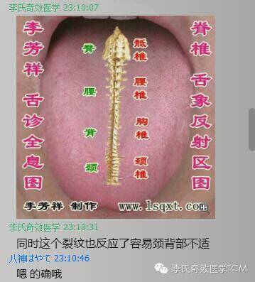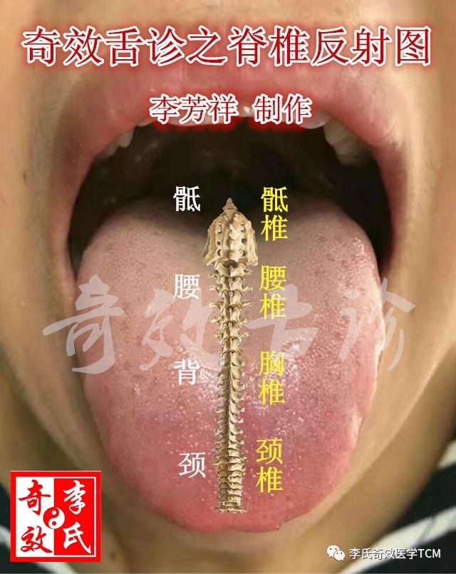 其他比如腹诊,也是可以从舌相上得到显现的,舌面高凸,其腹必胀,舌中凹陷,其腹必软。其他诸如脊柱诊断,也可以从舌相上获知,舌中线之前部看颈椎,中部看胸椎,下部看腰骶椎,中线不正,脊椎必然不正,中线侧弯,其脊柱必然侧弯,中线左偏,其脊柱也必然左偏。其他种种,均与舌诊逐一对应,于此,也不难领悟,为何圣贤会提出“望而知之谓之神”和“望而知之为上医”的说法了。其望而知之,其法最速,效率最高,信息最全,是其他诊断方式难以代替的一种诊查方式。
