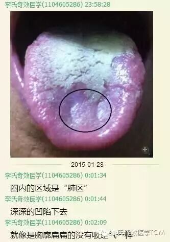 另外还有一种情况,也会造成胸闷,那就是肺这个区域,特别的高凸,这说明胸腔能量积聚在一起,不流通了,患者不但胸闷,还会四肋胀满,好像胸部像吹的鼓鼓的气球一样。这种情况属于实证导致的胸闷胀满(如下图),虽然下图对话中没有提及胸闷的症状,但是就舌相特点来看,是存在明显的胸闷胁胀症状的。