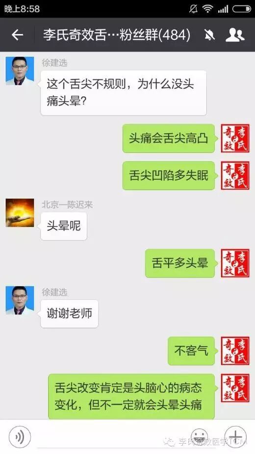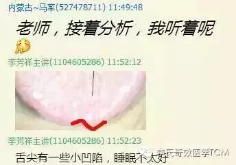 就像我在图片中的对话说的一样,这舌尖形状的改变,确实是头脑,心部出了问题,但是这些部位的问题就多了去了,如何能明确的诊断是失眠,还是嗜睡?是头痛,还是头晕,还是头沉?