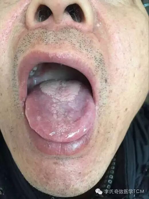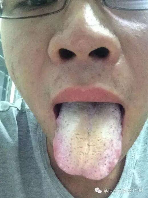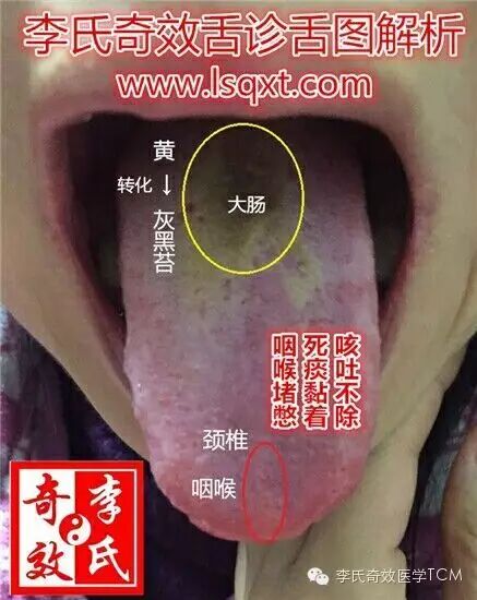 这个舌象舌苔没有那么多,这水分都煮没了,干锅了,就像煎中药,一直煎煮四五个小时,最后出来的药液非常的浓缩,炼湿为痰,水湿由火热慢慢的炙烤冶炼,浓缩成为死痰粘痰,所以大部分舌苔(水分)都被烤干了(少苔),只剩下一个局部(大肠),大肠不通,肺气不降,咽喉堵憋,死痰黏着。