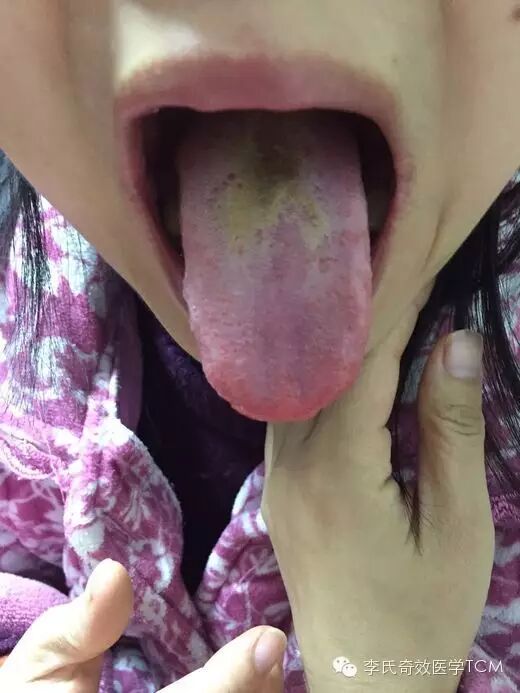 这个舌苔是由黄苔慢慢的像灰黑苔转化的过渡阶段,现在处于黄灰黑苔之间,上次课我们讲过了,这是内热逐渐炙烤导致的有黄,逐渐焦黄,转而焦黑。