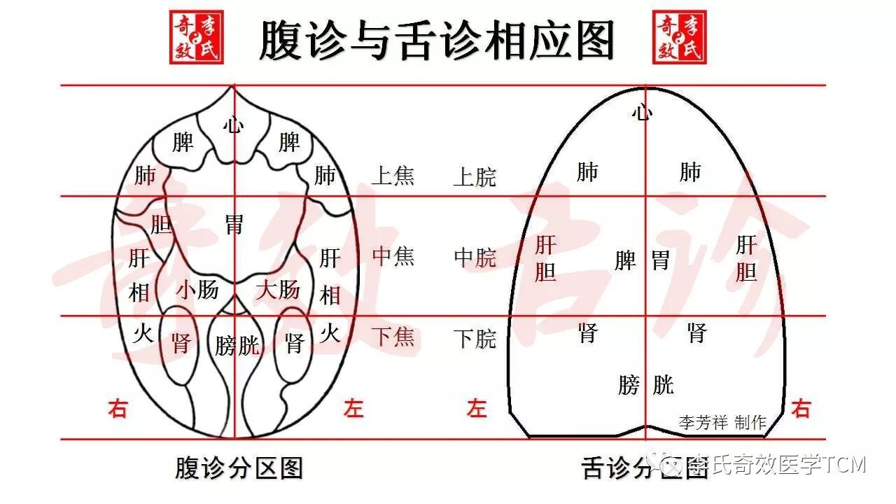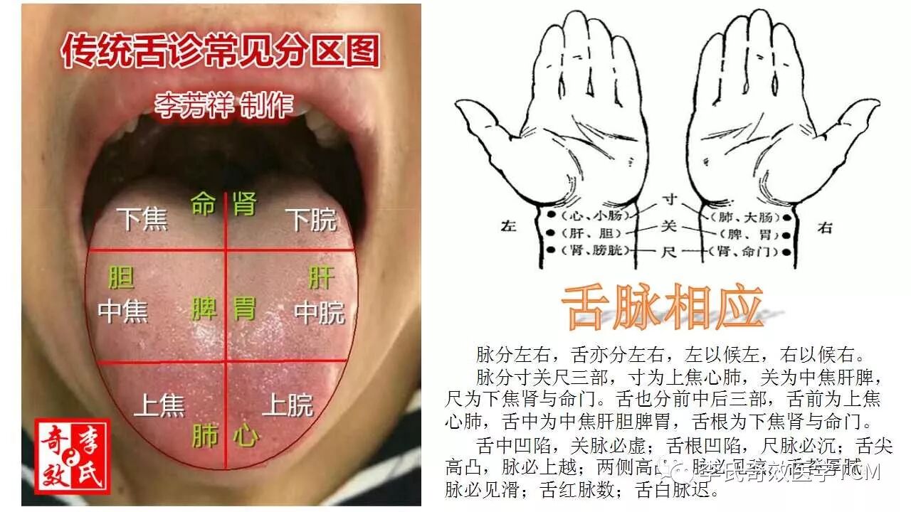 脉分左右,左手脉代表人体的左半身,右手脉代表人体的右半身。舌也分左右,左半侧舌代表人的左半身,右半侧舌代表人的右半身。脉分寸关尺,寸为上焦,在脏为心肺,关为中焦,在脏为肝脾,尺为下焦,在脏为肾。舌也分上中下三焦,前中后三部,舌前为心肺,舌中为肝脾,舌根为肾。