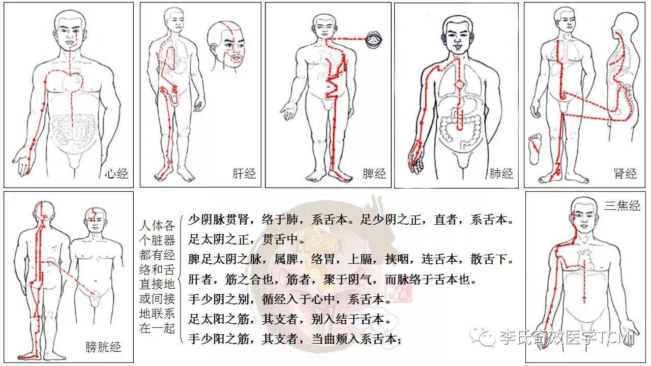 《黄帝内经》中记载,心、肝、脾、肾等脏及膀胱、三焦、胃等腑均通过经脉、经别、经筋与舌直接联系。至于肺、小肠、大肠、胆等,虽与舌无直接联系,但手足太阴相配,手足太阳相配,手足少阳相配,手足阳明相配,故肺、小肠、大肠、胆之经气,也可间接的通达于舌。