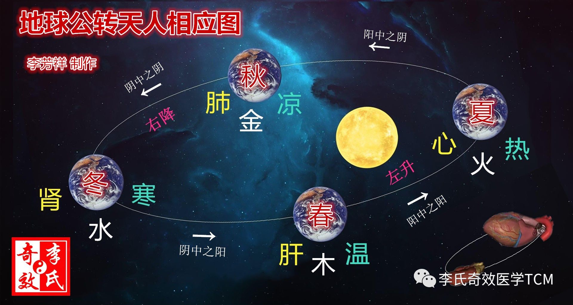 也就是中医里面说的,一气分阴阳,清者升,浊者降,阳升左旋,升到一半为春(温),升到顶端为夏(热),阴降于右,降到一半为秋(凉),降到底为冬(寒)。天人合一,放在人体也是一样的道理。一气(太极)生两仪(阴阳),两仪生四象(春夏秋冬)。所以这春夏秋冬,都是一个地球的运行变化所产生的不同象。也就是说肝、心、肺、肾,阴、阳、气、血都是一气的升降变化产生出来的。所以像什么金能生水,水能生木,气能生血等,他们是如何互生的?无非是一气运转到不同的位置,拥有了不同的命名而已。