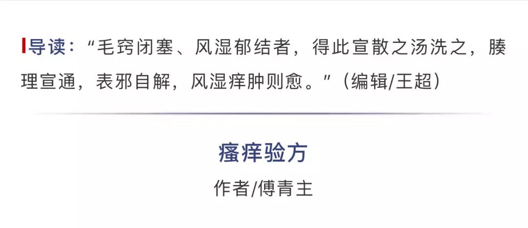 【方解】风湿郁于皮肤,常发痒肿、风疹之疾。方中花椒、蕲艾除风冷逐湿痹;防风治三十六种风,除经络中湿;大葱宣通上下之阳气,发散表邪。故毛窍闭塞、风湿郁结者,得此宣散之汤洗之,腠理宣通,表邪自解,风湿痒肿则愈。
