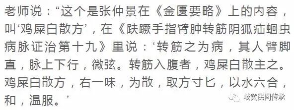 第二天,那患者来了,老师将那鸡屎白散给了患者,并且叮嘱患者用温水冲服2克。患者拿走药后,我好一阵担心,担心患者服后会恶心的呕吐。老师笑笑说道:“眼不见为净,你不告诉他具体是什么东西就行了,再说了良药苦口嘛!”患者拿走药后第三天又来复诊了,我好奇问患者服药后现在是什么情况。患者说好一点了,晚上(本文由岐黄民间传承公众号原创首发,属版权作品,未经授权严禁转载)抽筋次数减少了一点,就是药味道不好。我听完后心里想笑,也不敢告诉他是鸡屎。老师给患者说既然有效,那就效不更方继续服用。然后又过了七八天左右,患者又来复诊说现在已经好多了,晚上不再抽筋了,问能不能可以停药了。老师说道既然不抽筋了那就停药吧!患者说这是啥药啊效果这么好能不能把药方子给我。老师听完哈哈一笑以一句祖传秘方给打发了。我想如果当时老师说是鸡屎的话,不知道患者该是一个什么表情。
