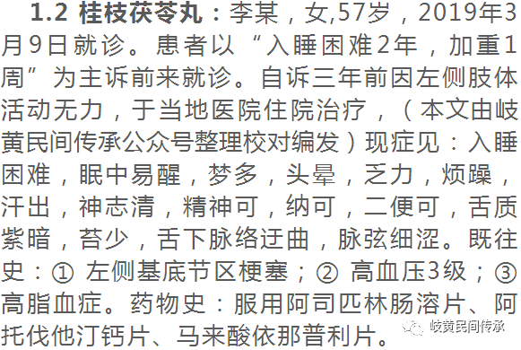 1.1 半夏泻心汤:姚某,女,15岁,2019年5月1日就诊。以“入睡困难3个月,加重1周”为主诉前来就诊。患者自诉3个月来每晚睡眠时间均为4个小时,未服用任何药物治疗,因高一学业压力繁重,导致睡眠问题出现;近一周来,明显加重,甚则彻夜未眠。现症见:入睡困难,睡眠时间日均2个小时,严重时彻夜未眠,眠中易醒,醒后难以入睡,梦多(以噩梦为主),乏力,腹部胀满,打嗝较多,(本文由岐黄民间传承公众号整理校对编发)肚脐周围疼痛,纳差,便秘,排便困难,大便2~3日一次,舌体淡胖,边有齿痕,舌尖红,苔白,脉弱缓。月经史:月经周期紊乱,经色发暗,经血中有瘀块。中医诊断为不寐,辨证为太阳病-痞证(半夏泻心汤证),给予半夏泻心汤加减,方药如下:姜半夏12 g,黄连6 g,黄芩10 g,党参10 g,干姜9 g,炙甘草9 g,酸枣仁20 g,珍珠母30 g。7剂,水煎服。