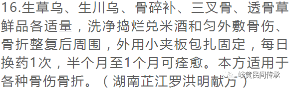 12.螃蟹、珍珠母、四脚蛇、伸筋草、仙鹤草、白芨各30g、鱼骨 180g、人参 20g共焙干研末,兑 50度白酒,制成糊状,敷于骨折已正骨复位的周围,然后夹板包扎固定,一般6小时可接活各类骨折。(湖南芷江杨荃杰献方)