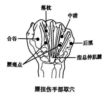 选取手阳明大肠经合谷穴配合中渚穴,也可治疗腰扭伤。取合谷穴,要靠第二掌骨侧进针,这样会出现较强的酸胀感(在肌肉丰富处多产生酸感,近关节处多胀重感)。